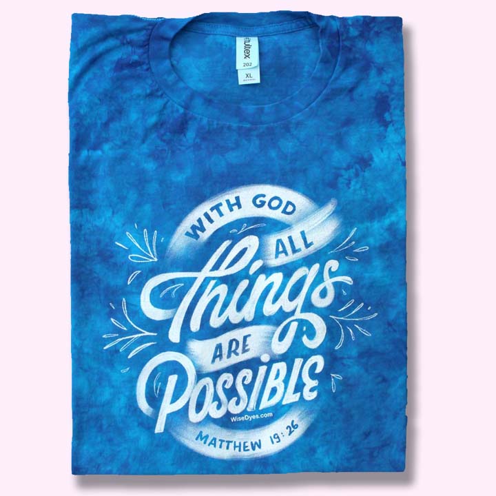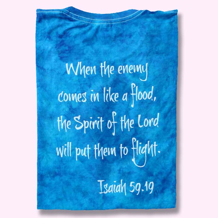 T-shirts are hand dyed and screen-printed on high quality heavyweight 100% cotton garments. The colors are deep, rich and long-lasting. Design on the front, scripture on the back.